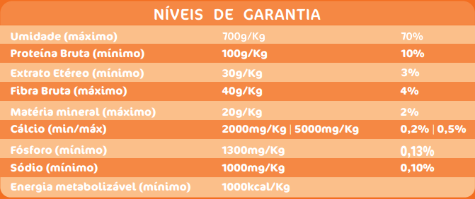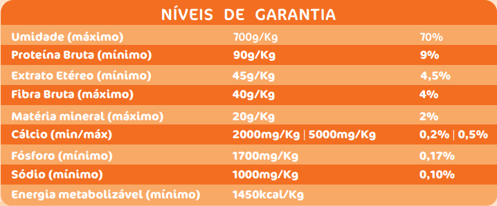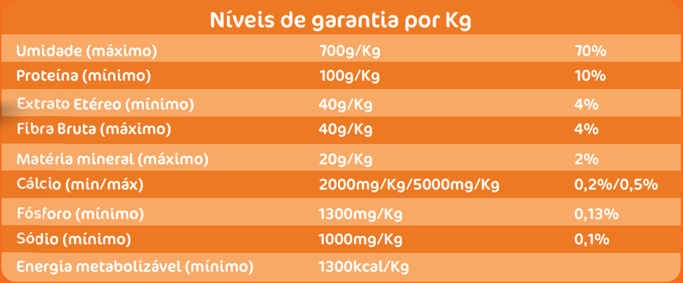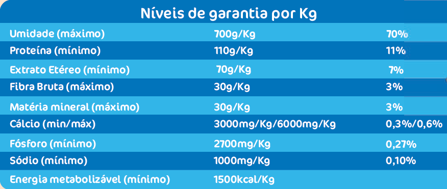 Vitamina A (mínimo) 4749UI, vitamina E (mínimo) 23UI, vitamina D3 (mínimo) 569UI, vitamina K3 (mínimo) 0,47mg, vitamina B1 (mínimo) 1,6mg, vitamina B2 (mínimo) 2,1 mg, vitamina B6 (mínimo) 1,6mg , vitamina B12 (mínimo) 15mcg, niacina (mínimo) 19mg, biotina (mínimo) 0,02mg, ácido fólico (mínimo) 0,19mg, ácido pantotênico (mínimo) 8,17mg, ferro (mínimo) 60, cobre (mínimo) 4mg, zinco (mínimo) 53mg, manganês (mínimo) 4,3mg, selênio (mínimo) 0,11mg, iodo (mínimo) 0,76mg e colina (mínimo) 151mg.