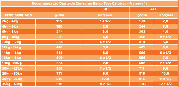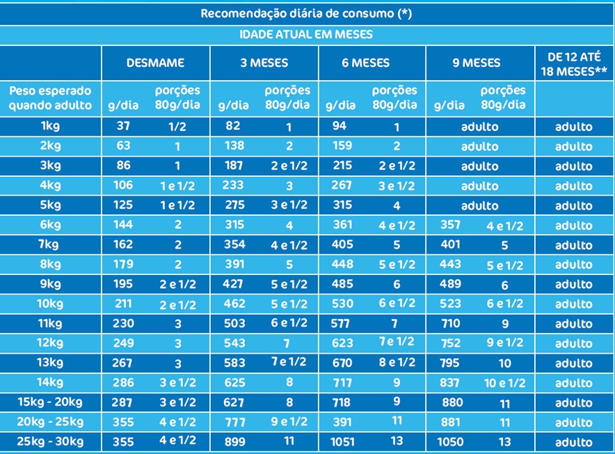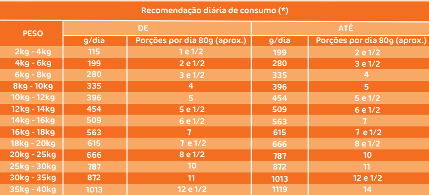 Siga a orientação do Médico Veterinário ou utilize a Tabela de Consumo Diário abaixo.
