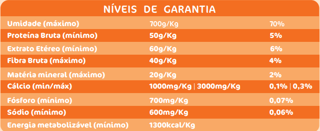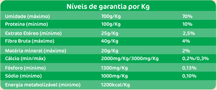Vitamina A (Minímo) 5.000 UI, Vitamina E (Minímo) 25 UI , Vitamina D3 (Minímo) 600 UI, Vitamina K3 (Minímo) 0,5 mg, Vitamina B1 (Minímo) 1,2 mg; Vitamina B2 (Minímo) 2,2 mg, Vitamina B6 (Minímo) 1 mg, Vitamina B12 (Minímo) 16 mcg, Niacina (Minímo) 12,5 mg, Biotina (Minímo) 0,03 mg, Ácido Fólico (Minímo) 0,2 mg, Ácido Pantotênico (Minímo) 7,5 mg, Ferro (Minímo) 40 mg, Cobre (Minímo) 4 mg, Zinco (Minímo) 50 mg, Manganês (Minímo) 2,5 mg, Selênio (Minímo) 0,1 mg, Iodo (Minímo) 0,8 mg, Colina (Minímo) 1600 mg.