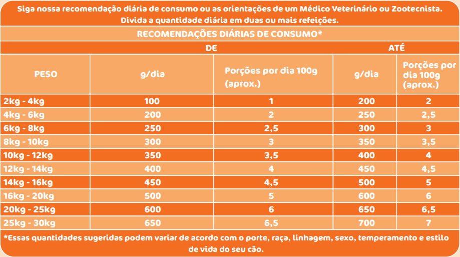 Siga a orientação de consumo do Médico Veterinários/Zootecnista ou utilize a tabela abaixo de consumo diário. Divida em duas ou mais refeições ao dia.